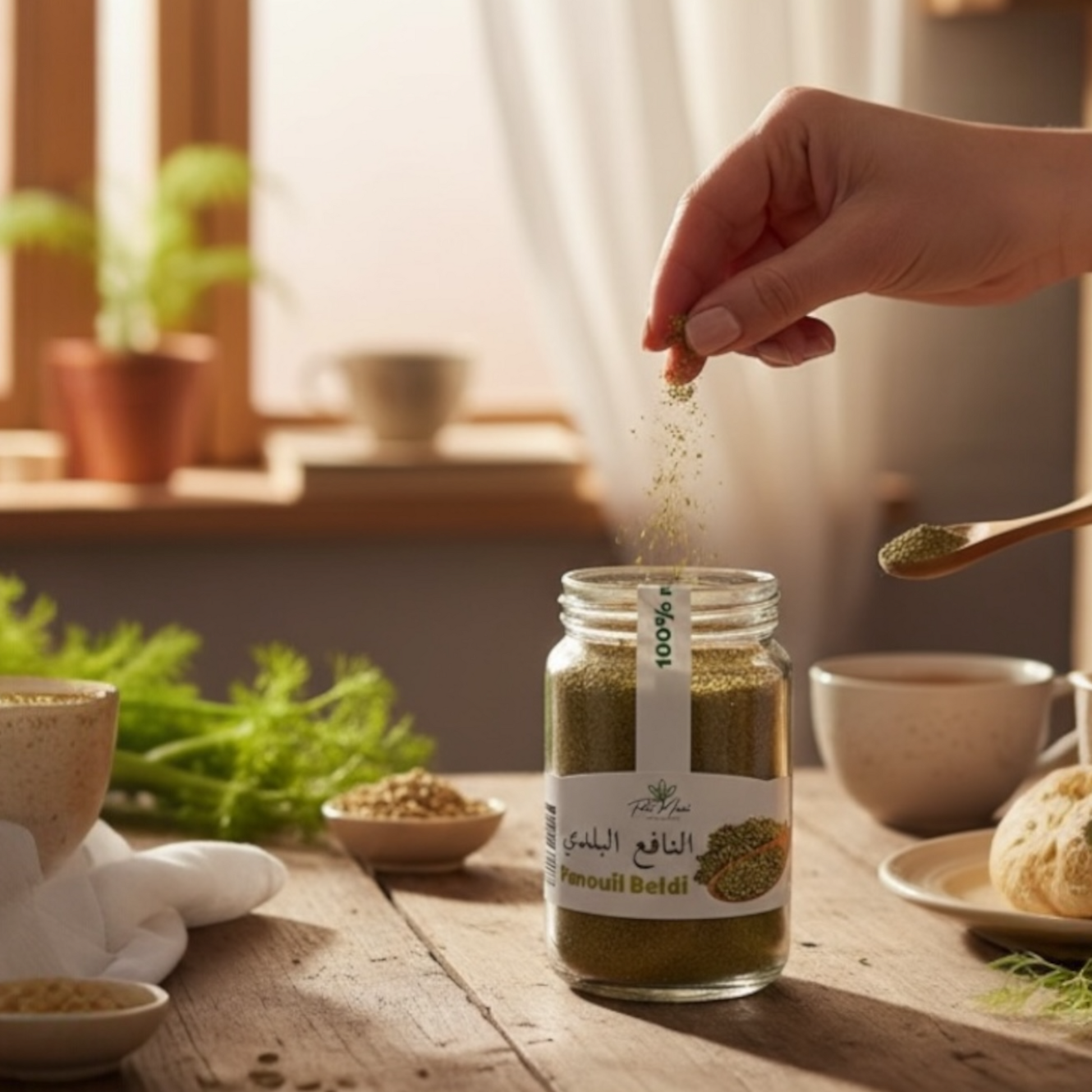 Utilisé depuis des générations, le fenouil beldi est reconnu pour contribuer au confort digestif et pour ses propriétés naturellement apaisantes. En cuisine, il parfume délicatement les plats, infusions, pains, pâtisseries et mélanges d’épices, apportant une touche authentique et raffinée.